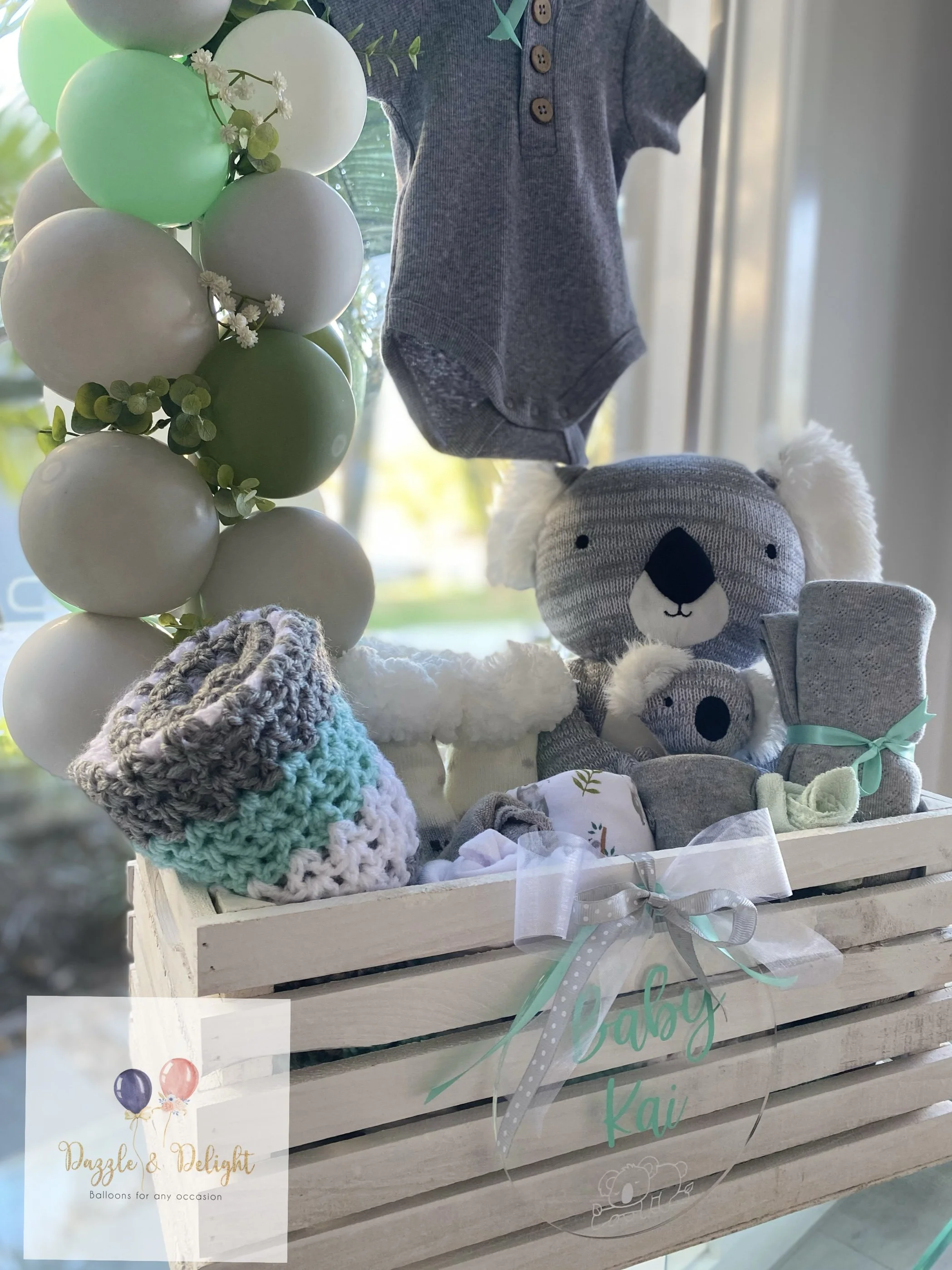 The Fill Yourself Hamper includes the wooden crate, fully decorated, florals, ribbons and bows as well as a mini balloon garland, ready for you to fill with gifts for the new parents or new baby. Filling the hamper yourself is a great choice when you know exactly what it is the recipient would like and makes it perfect to give a gift to a whole new family, not just the child. $95